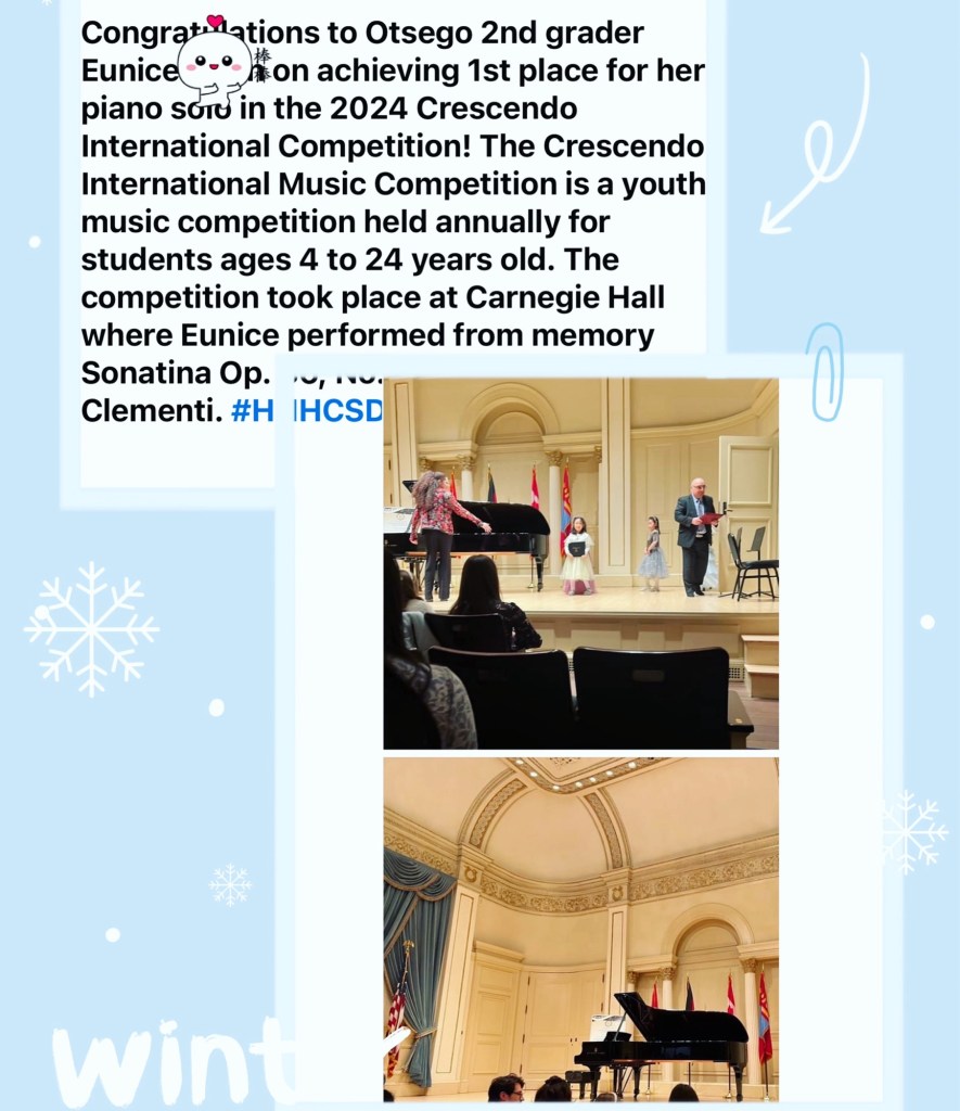 Eunice, Chloe, and R.P. won 1st Place & 2nd Place at 2024 Cresendo International Music Competition & piano solo performances at Carnegie Hall, February 2024. Esther, Brennan, and Darien earned 3rd place in the competition.